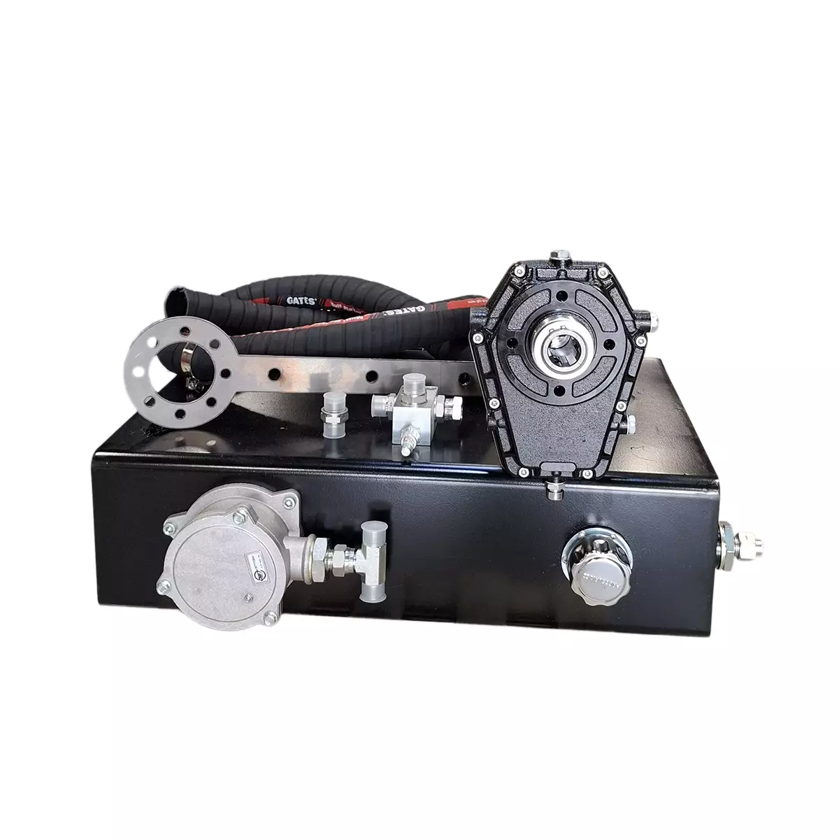 Svetsbar adapterplåt i 8 mm för multiplikatorpumpen + passande bultar.