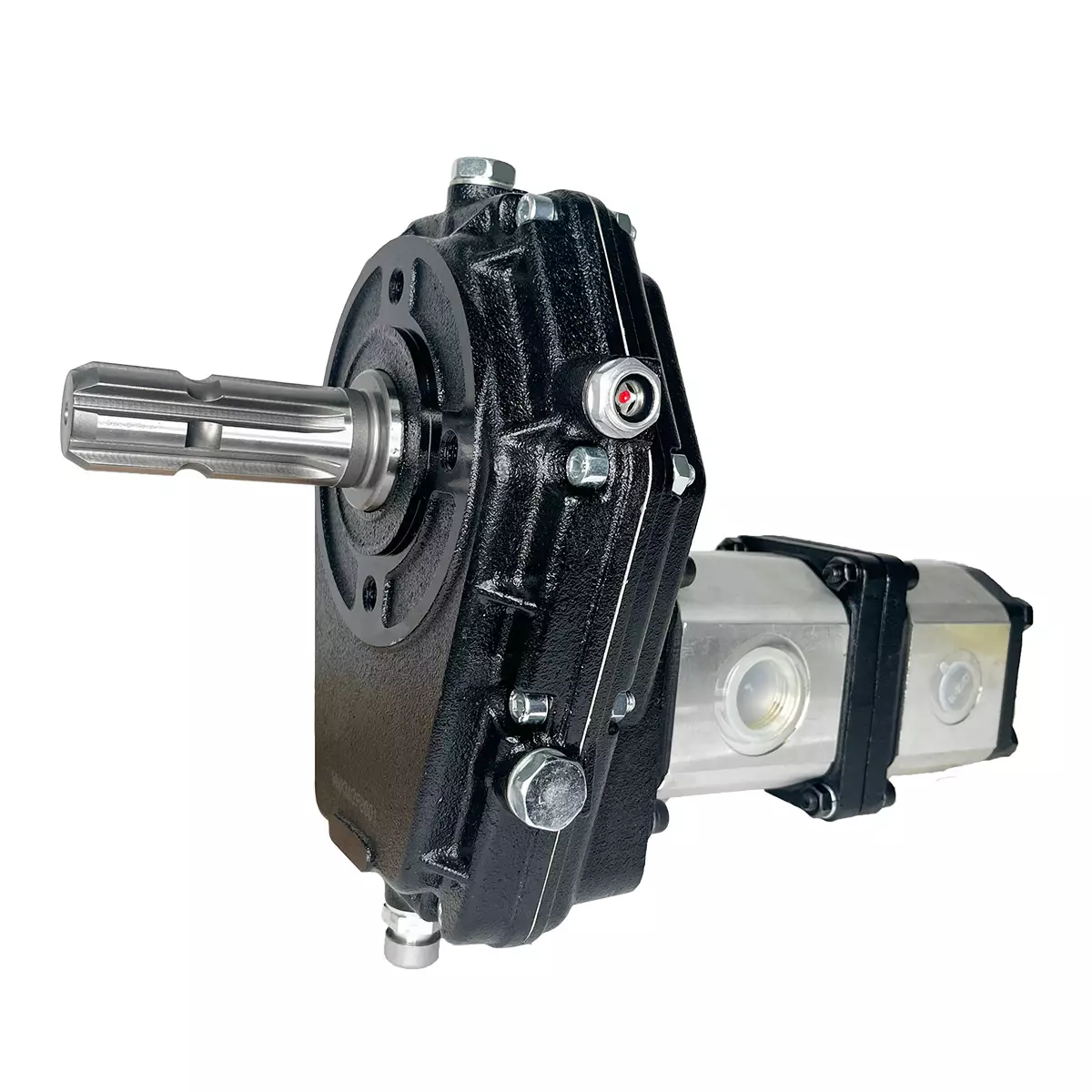 Den gjutjärnskonstruerade växellådan ökar kraftuttagets varvtal med 1:3,5. Med en dubbelpump kopplad till växellådan kan du enkelt bygga ett hydrauliksystem som kräver två oberoende funktioner. Perfekt exempelvis för en vedklyv där klyven drivs av en pump och transportören av en annan.