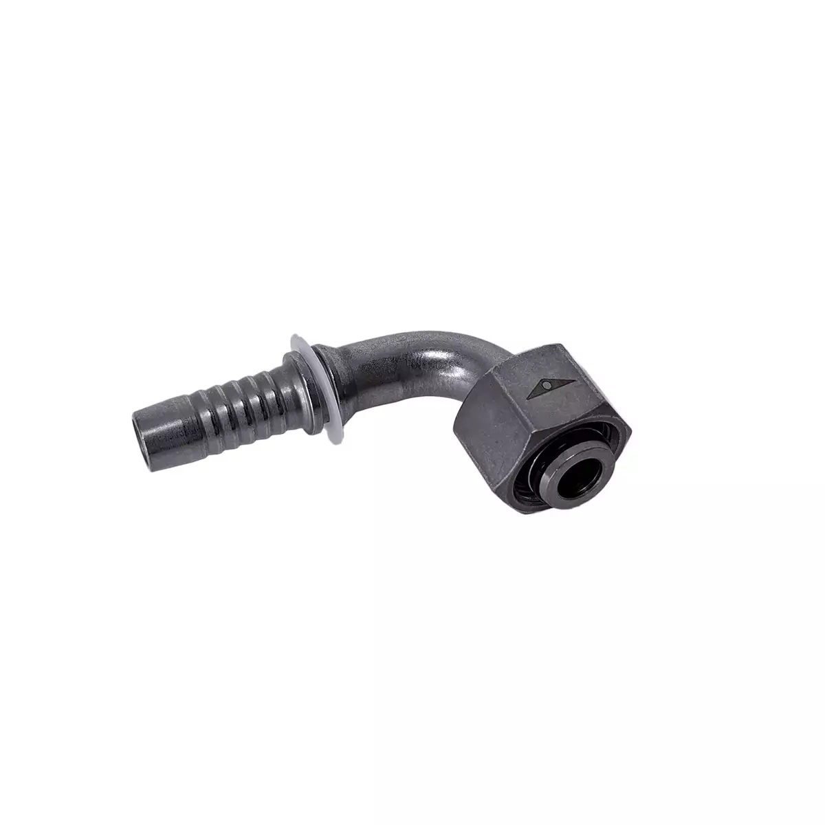 90° koppling med invändig gänga och röranslutning – med zink-nickelbeläggning. För övergång från rör till slang. Kopplingen har en O-ringstätning.